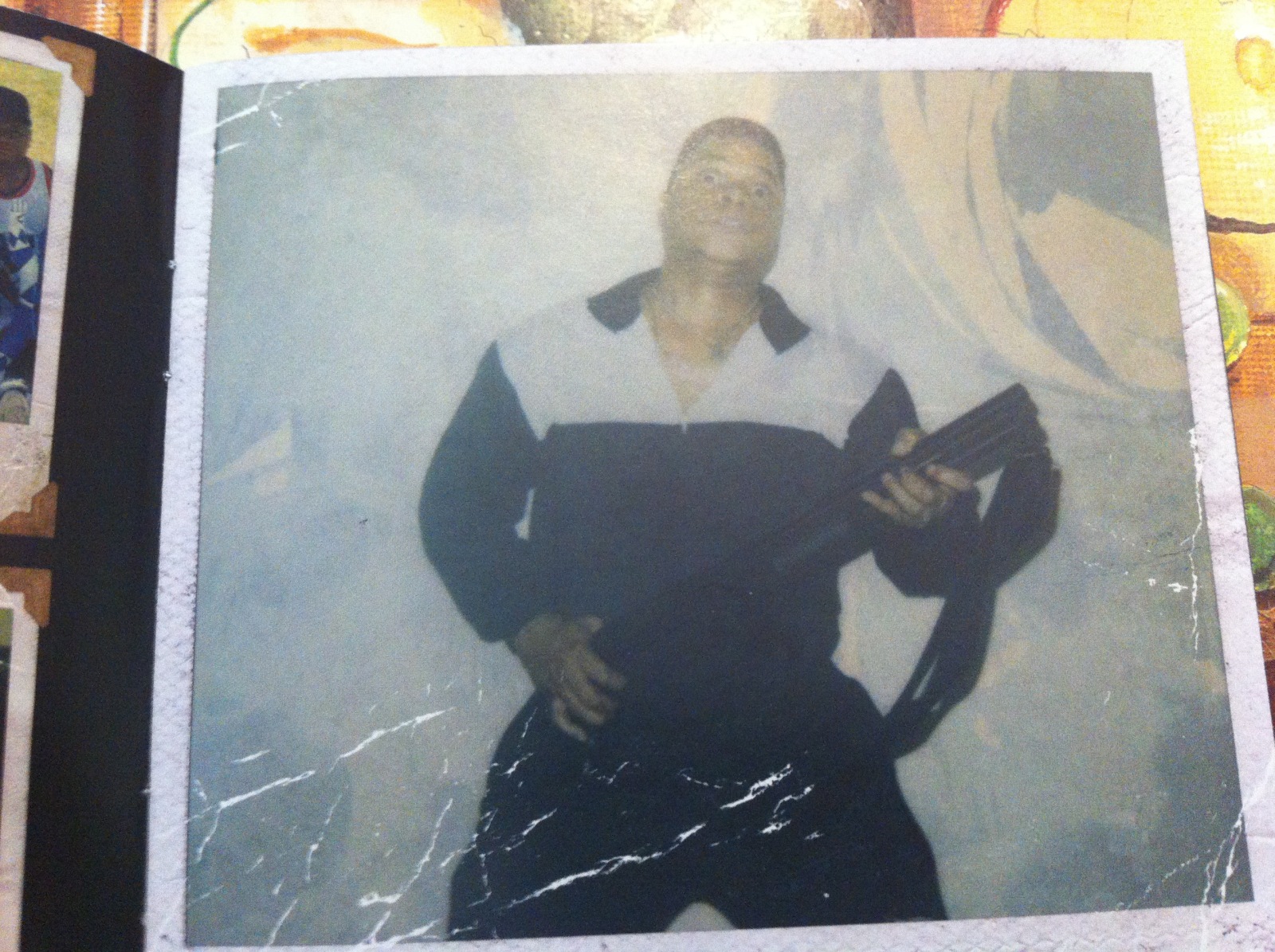 “Two of my uncles, just two of them. To the far right, that’s my grandpa and a baby bottle next to a 40-ounce next to a gang sign, holding a kid. It’s not just music to me. This is a story about the youth and the people that they call delinquents in my city. You look in the background and you see a picture on the wall of me and my pops. And the eyes blanked out, that’s for my own personal reasons — you’ll probably hear about that in the album, but that photo just says so much about my life and how I was raised in Compton and the things I’ve seen just through them innocent eyes. You don’t see no one else’s eyes, but you see my eyes of innocence and trying to figure out what’s going on.“-Kendrick Lamar